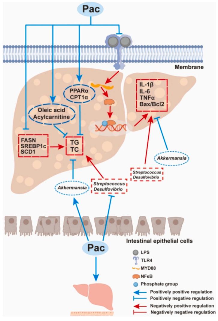 在发表于《Food Research International》(农林科学一区Top)的研究中,团队探讨了茯苓酸(Pac)改善代谢相关脂肪性肝病的作用机制。代谢相关脂肪性肝病以肝细胞脂肪变性为主要特征,与肥胖、胰岛素抵抗及代谢综合征密切相关。研究团队通过多组学联合分析方法,系统阐明了Pac的保肝护肝机制。转录组分析显示Pac主要调控脂代谢、细胞凋亡和炎症反应相关基因表达,抑制脂肪酸合成酶、固醇调节元件结合蛋白1c和硬脂酰辅酶A去饱和酶1的表达,同时上调过氧化物酶体增殖物激活受体α和肉毒碱棕榈酰基转移酶1α。肠道菌群16S rRNA测序表明Pac干预可降低Firmicutes/Bacteroidetes比值,恢复Akkermansia菌属丰度,减少Desulfovibrio和Streptococcus丰度,改善肠道菌群失调,恢复肠屏障功能,减少脂多糖(LPS)泄漏,调控LPS/TLR4/MYD88/NFκB通路,降低肝脏炎症因子表达,减少肝细胞凋亡。非靶向肝脏代谢组学分析发现Pac干预后酰基肉碱和油酸水平升高,促进脂肪酸氧化分解。综上所述,Pac通过协同调控肠道菌群、脂质代谢、炎症和凋亡途径,有效改善了高脂饮食诱导的肝脏脂质蓄积和损伤。